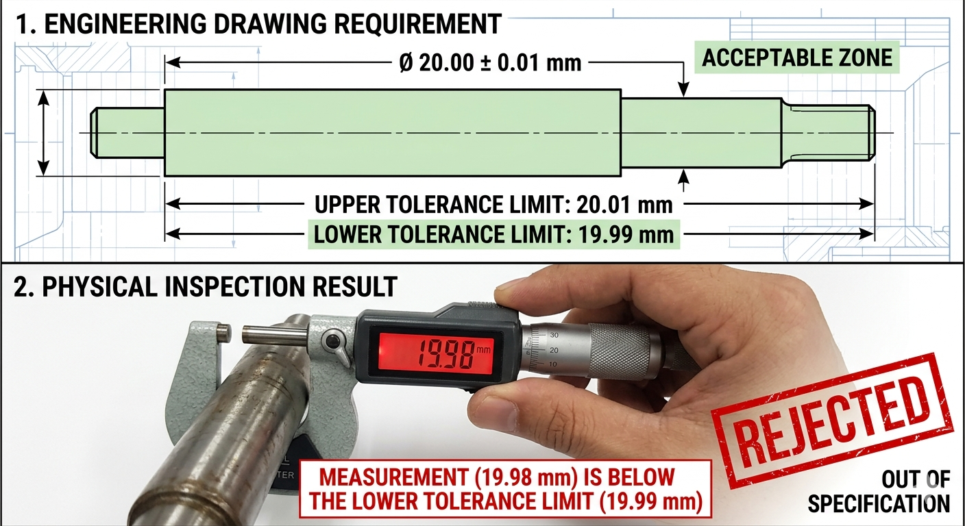 Going back to the previous example if the measured diameter is 19.98 mm and the specified tolerance is 20.0 plus-minus 0.01 mm, The inspection will reject it because the lower limit is 19.99 mm.