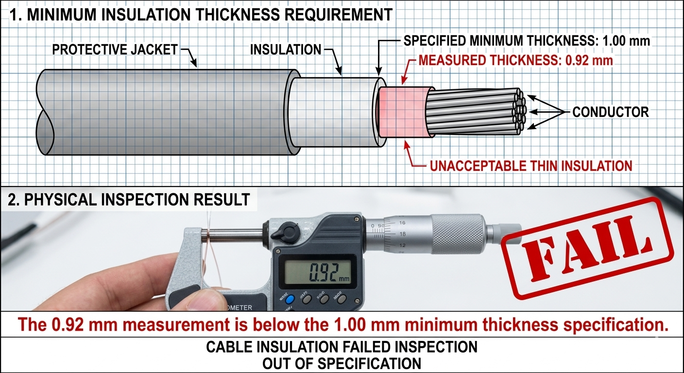 Inspection takes these numbers and compares them to preset references. For example, if the minimum allowed insulation thickness should be 1.00 mm, then 0.97 mm is not going to do its job. If the required tensile strength is at least 400 MPa, then 425 MPa is going to be fine.